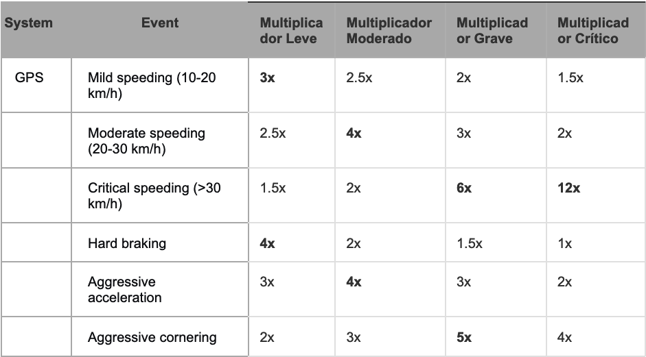 Having explained the factors affecting operation, as well as the events that identify poor driving habits, the formula used to score drivers is described below: