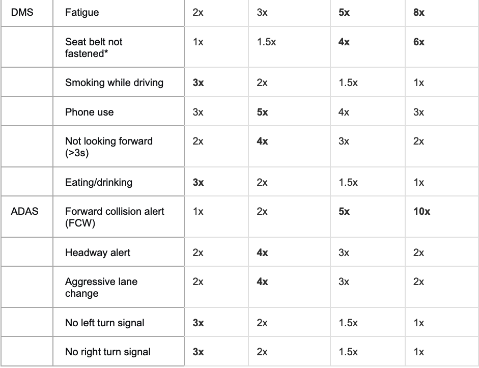 - The highest risk multipliers are for critical speeding (12x), forward collision warnings (10x), and accelerator at 100% (9x) for critical accidents