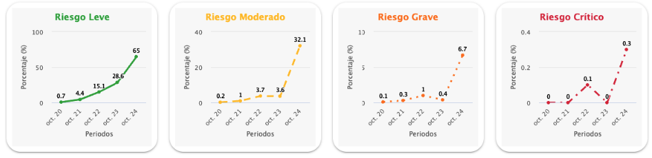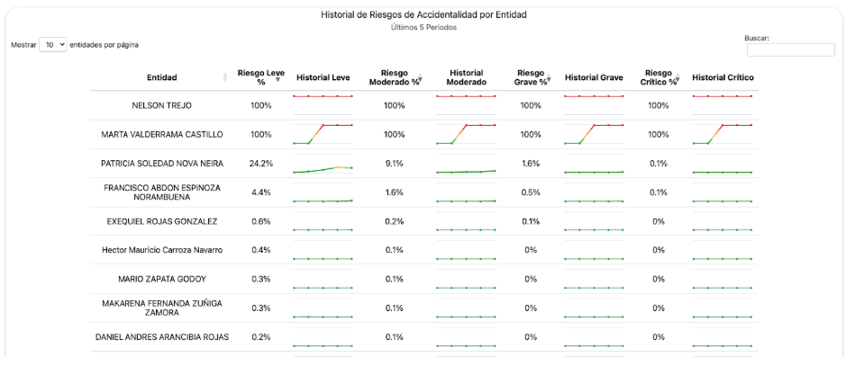Shows the accident risk history of each driver in a group over the last 5 periods, organized from highest to lowest risk for easy identification of drivers who should be warned or trained as a priority.