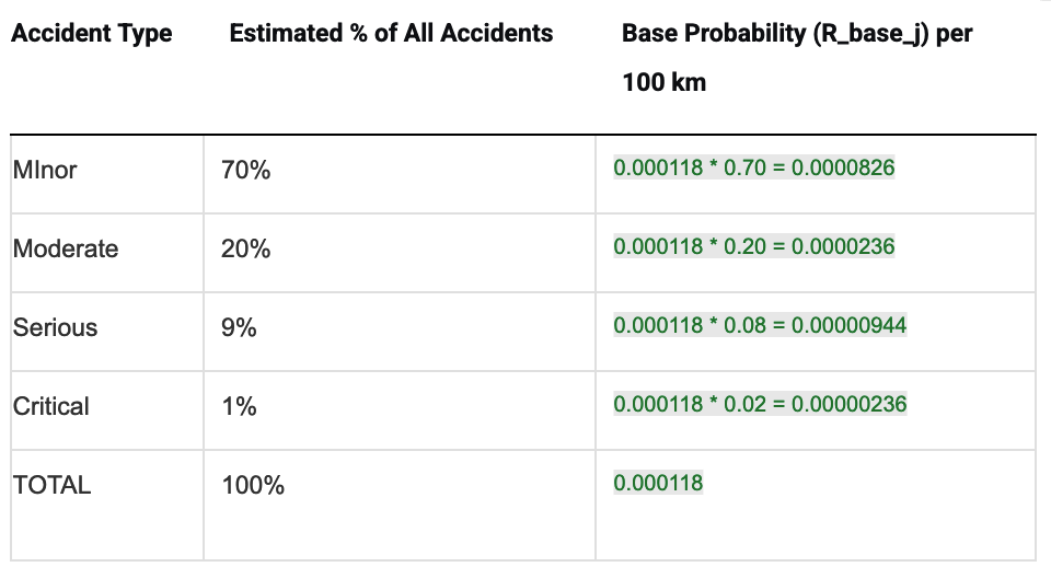 Note: The base probability of 0.000118 accidents per kilometer is derived from U.S. national statistics showing approximately 1.9 accidents per million miles traveled, converted to a per-kilometer basis for a standardized risk assessment model.