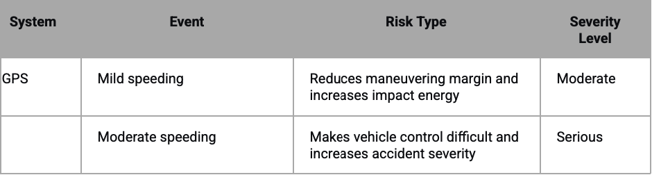 - Speeding Detected by GPS: Speeding incidents detected based on GPS device settings, used to alert excessive speeds for various vehicle types or critical operational points such as hazardous curves, when combined with geofencing configurations in the GPS device.
