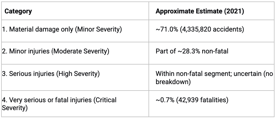 Within this 29%, public data does not break down how many injuries were minor, serious, or very serious/fatal. However, it is known that there were 42,939 fatalities, representing only 0.7% of total accidents: